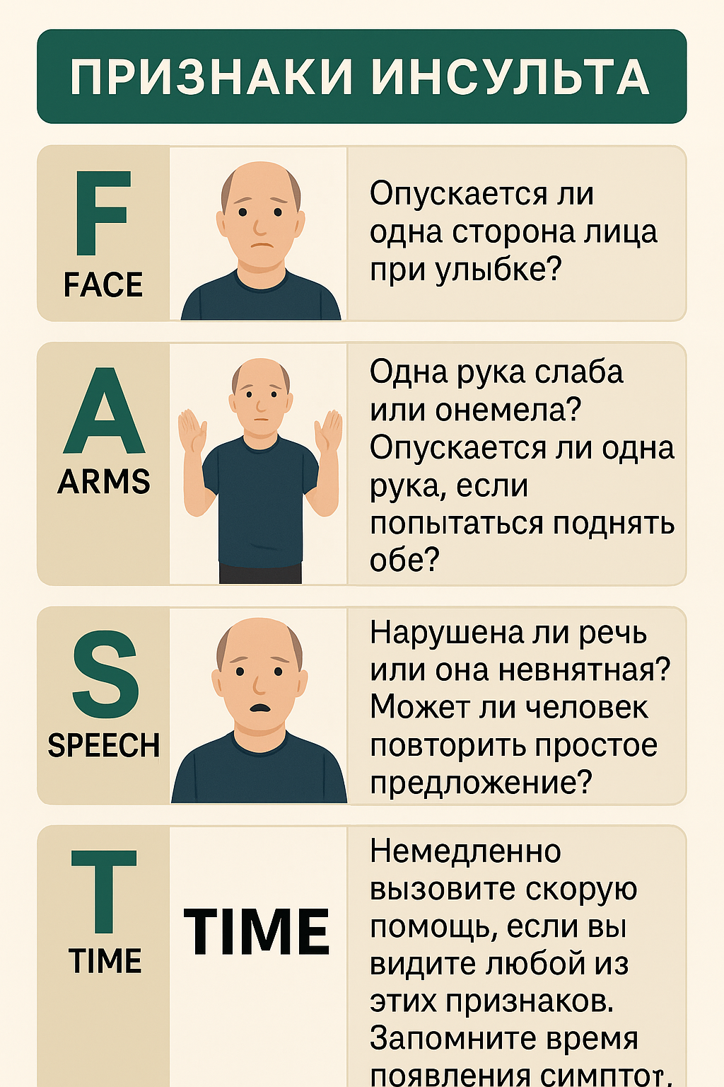«Если симптомы исчезли, всё в порядке.» | Опасное заблуждение. Это может быть ТИА (мини-инсульт) — сигнал о высокой опасности повторного инсульта. |